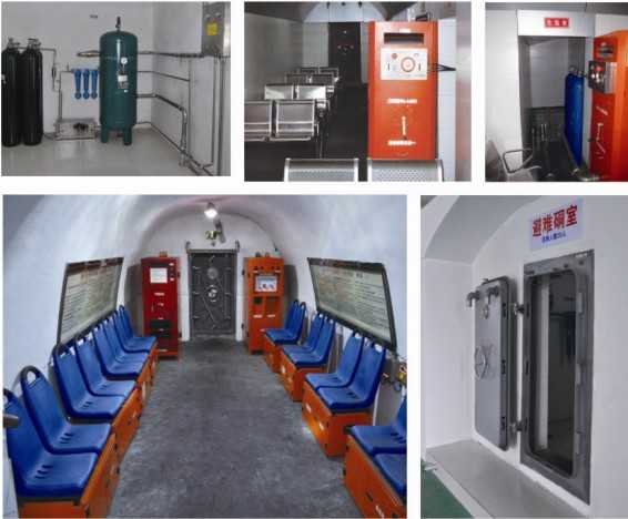 避難硐室設(shè)置在式煤礦井下適當位置,配備有維持人員生存所需的相關(guān)設(shè)備設(shè)施和食物、水等,為保證煤礦災(zāi)害發(fā)生時,給無法撤離災(zāi)區(qū)的遇險人員提供生命保障的空間。避難硐室與礦井安全監(jiān)測監(jiān)控、人員定位、壓風自救、供水施救、通信聯(lián)絡(luò)等系統(tǒng)相連,形成井下整體性的安全避難系統(tǒng),主要由防爆密閉系統(tǒng)、氧氣供給系統(tǒng)、通訊及人員定位系統(tǒng)、監(jiān)測監(jiān)控系統(tǒng)、環(huán)境控制系統(tǒng)、照明系統(tǒng)、生存保障系統(tǒng)組成。